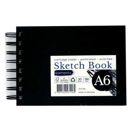 A6 Elements Hardback Wirebound Landscape Sketchbook with 50 sheets in 180g soft white paper. Micro-perforated sheets for clean, easy removal if required. Suitable for pencil, ink, marker, graphite, charcoal, pastel, dry technique gouache or watercolour.